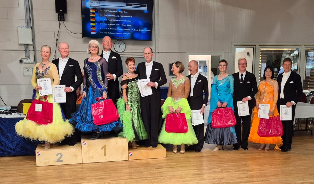 Beate und Theo starteten das erste Mal in der neuen Altersklasse Senioren IV A. Hier hatten sich 9 Paare eingefunden, so dass es eine Vorrunde mit 2 Gruppen gab. Erfreulicherweise konnten sich die Beiden in der Vorrunde durchsetzen, so dass es zu einer Teilnahme im Finale kam. Hier erreichten Theo und Beate einen 5. Platz und waren zufrieden mit ihrer tänzerischen Leistung.